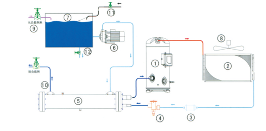 1、壓縮機 2、殼管式冷凝器 3、干燥過濾器 4、熱力膨脹閥 5、干式蒸發(fā)器 6、不銹鋼水泵 7、水箱
